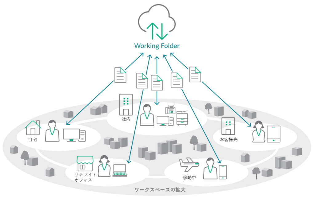 Working Folderを使えば、コピー機でスキャンした書類をそのままクラウド上にアップロードでき、本社・支店・営業所・自宅のどこにいても同じファイルを同時に閲覧・保存・共有できます。